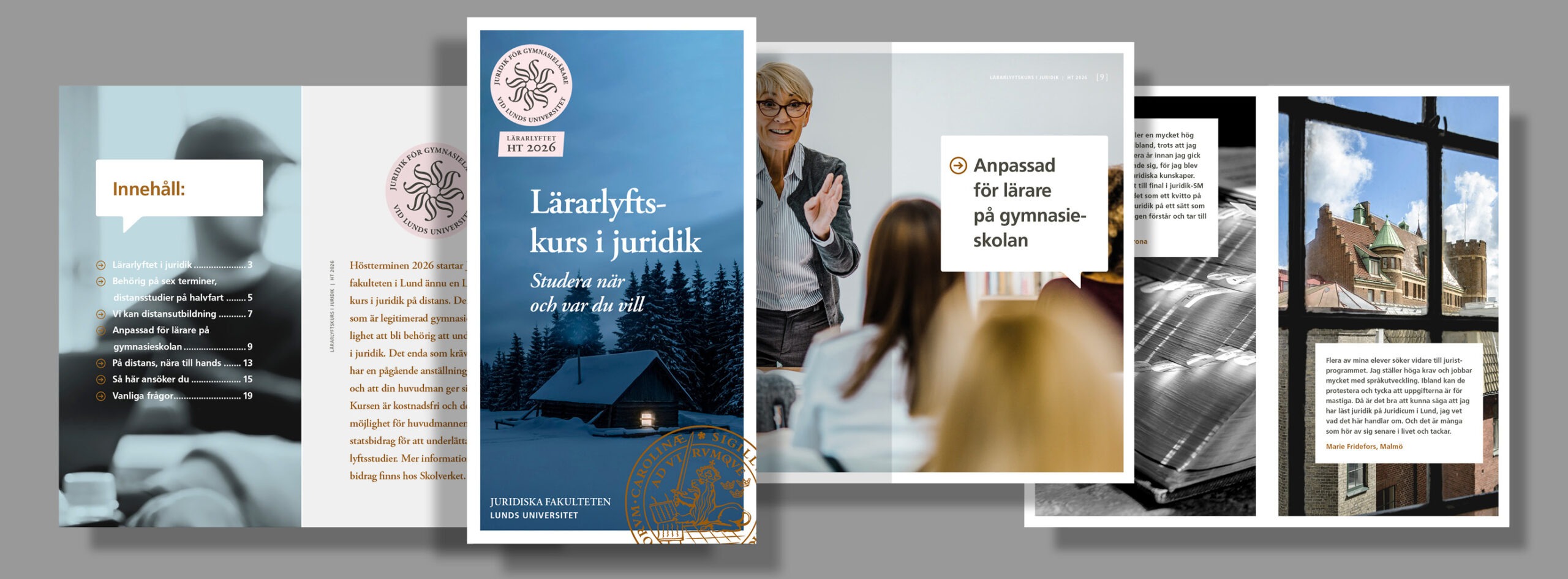 Broschyr (bild ovan): 32 sidor, 110 × 200 mm (Lärarlyftskurs i juridik), Folder (ej på bild): 12 sidor, 110 × 200 mm (Lärarlyftets alumner)